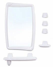 Обычный белый пластиковый набор, тонкое зеркало, легкий, шурупы все в наборе. Брала в подарок, получателю понравилось. Пришло упакованный в коробке.