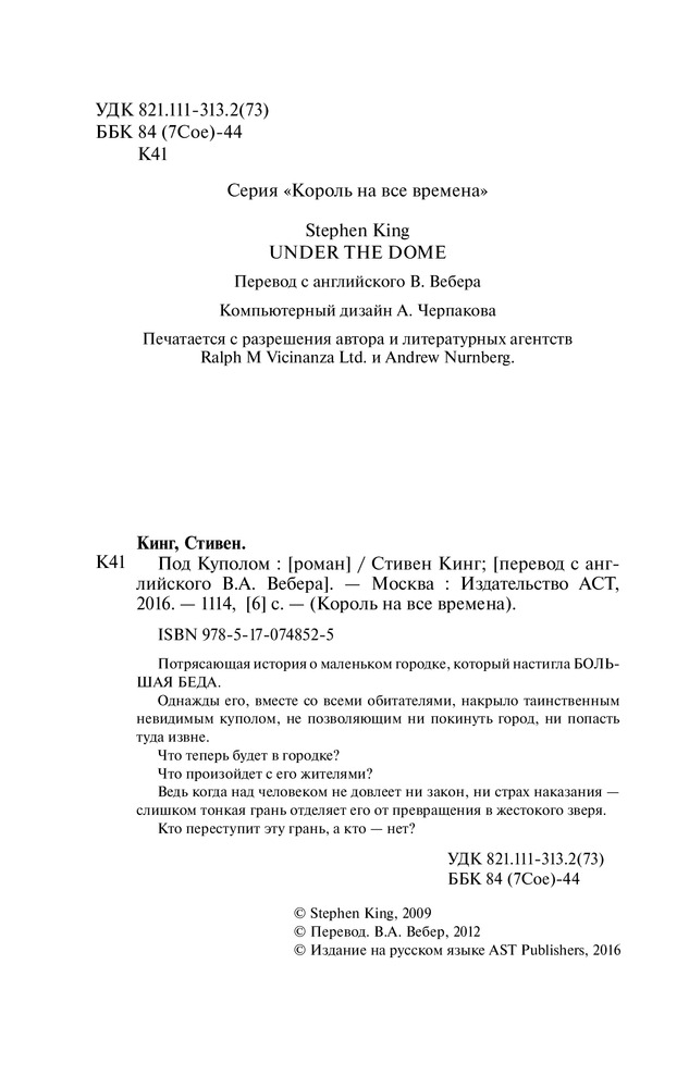 💳 Оплатить за товар можно при получении 🇰🇿 Есть бесплатная доставка по Казахстану 🎁 Копите бонусы с каждой покупки Серия: Король на все времена История маленького городка, который настигла большая беда. Однажды его, вместе со всеми обитателями, накрыло таинственным невидимым куполом, не позволяющим ни покинуть город, ни попасть туда извне. Что теперь будет в городке? Что произойдет с его жителями? Ведь когда над человеком не довлеет ни закон, ни страх наказания — слишком тонкая грань отделяет его от превращения в жестокого зверя. Кто переступит эту грань, а кто — нет? |