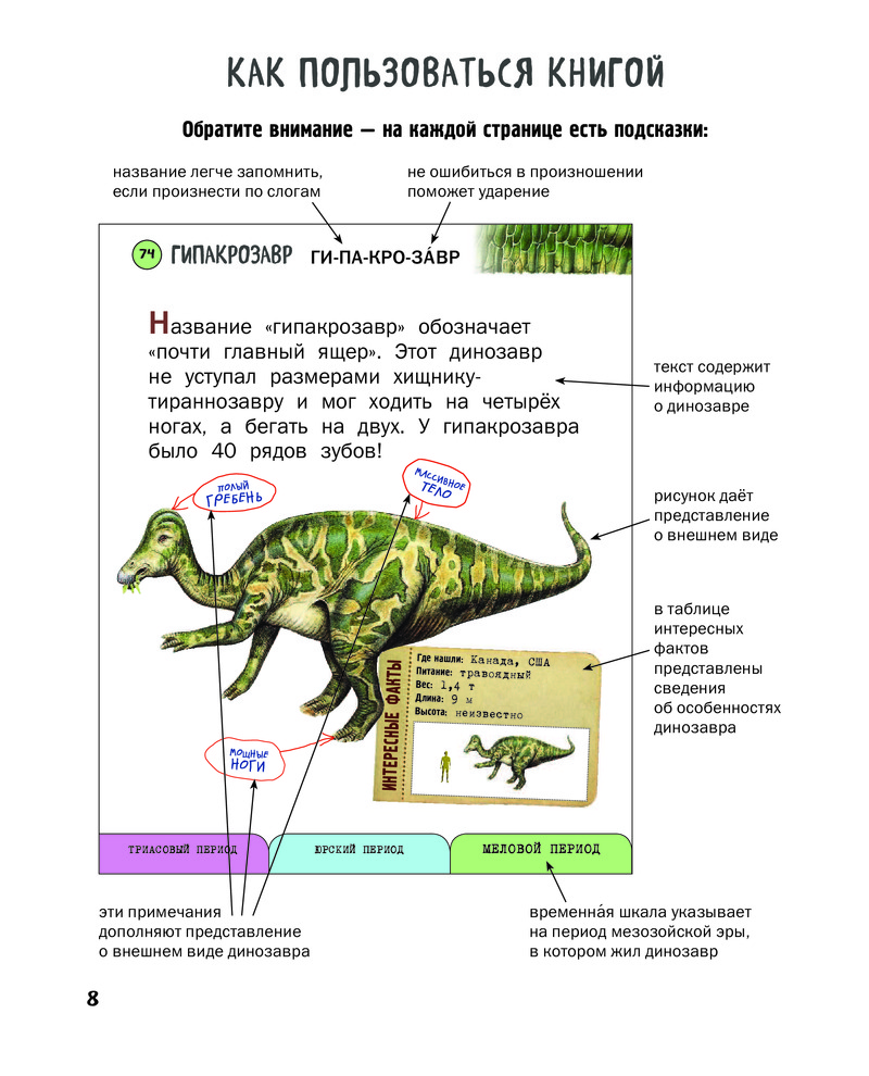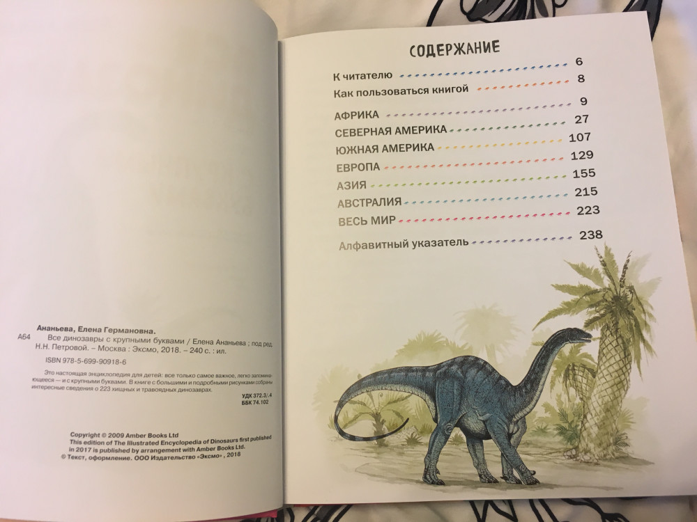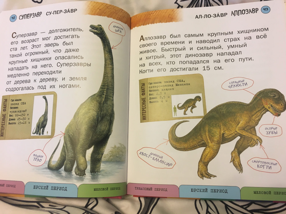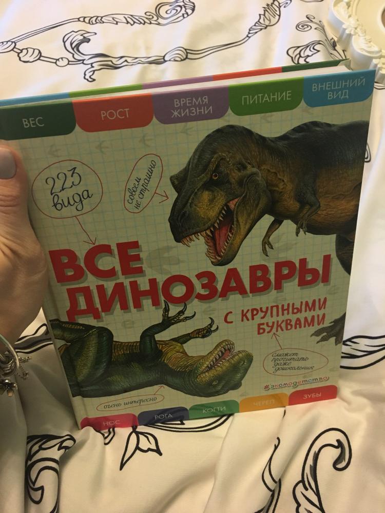 Книга супер, сын обожает динозавров знает более 100 названий!У нас много книг про динозавров вот теперь ещё и эта, тут есть те виды которых мы ещё не знали, крупные буквы, легкое понятное описание, ребёнок в восторге