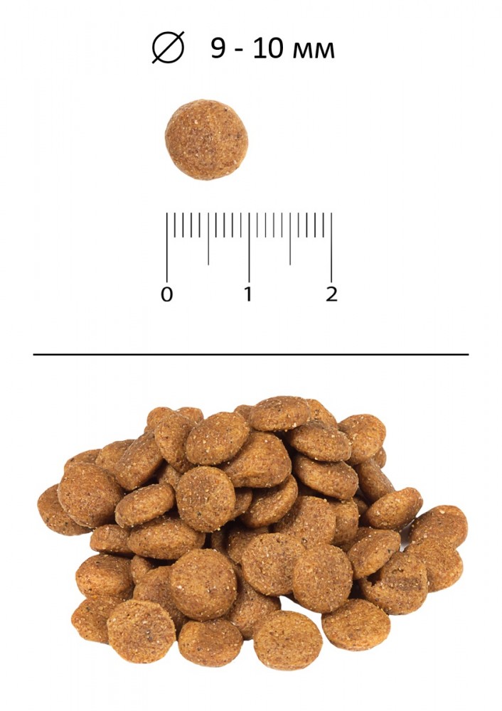 Состав: дегидрированное мясо курицы (минимум 19%), цельный рис, цельная кукуруза, кукурузная мука, гидролизованный белок, куриный жир, гидролизованная печень курицы, рыбий жир, яйцо, свекольная пульпа, витаминно-минеральный премикс (витамины А, Д3, Е, холин хлорид, В3, В5, В2, В1, В6, фолиевая кислота, В12, калий, цинк, железо, марганец, медь, йод, селен), карбонат кальция, дрожжи, метионин, лизин, экстракты юкки Шидигера, фукуса, пробиотик — живые микроорганизмы Bacillus subtilis и Bacillus licheniformis, экстракты фенхеля и розмарина, антиоксидант. |