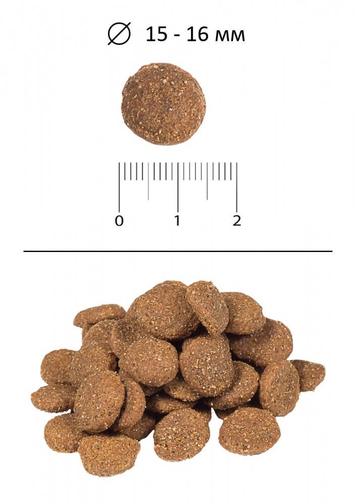 Состав: дегидрированное мясо индейки и свинины (30%), рис, ячмень, кукуруза, рыбий и куриный жир, сушеная мякоть свеклы, кукурузные рыльца, гидролизованная куриная печень, витаминно-минеральный премикс (витамины: А, Д3, Е, холин хлорид, бетаин, В3, В5, В2, В1, В6, фолиевая кислота, В12, калий, цинк, железо, марганец, медь, йод, селен), дегидратированное яйцо, дрожжи — источник мананн-олигосахаридов (MOS), яблоко сушеное, инулин — фруктоолигосахарид (FOS), глюкозамина гидрохлорид, хондроитина сульфат, пробиотик — живые микроорганизмы Bacillus subtilis и Bacillus licheniformis, экстракты фенхеля, розмарина, Юкки Шидигера, фукус, антиоксидант.