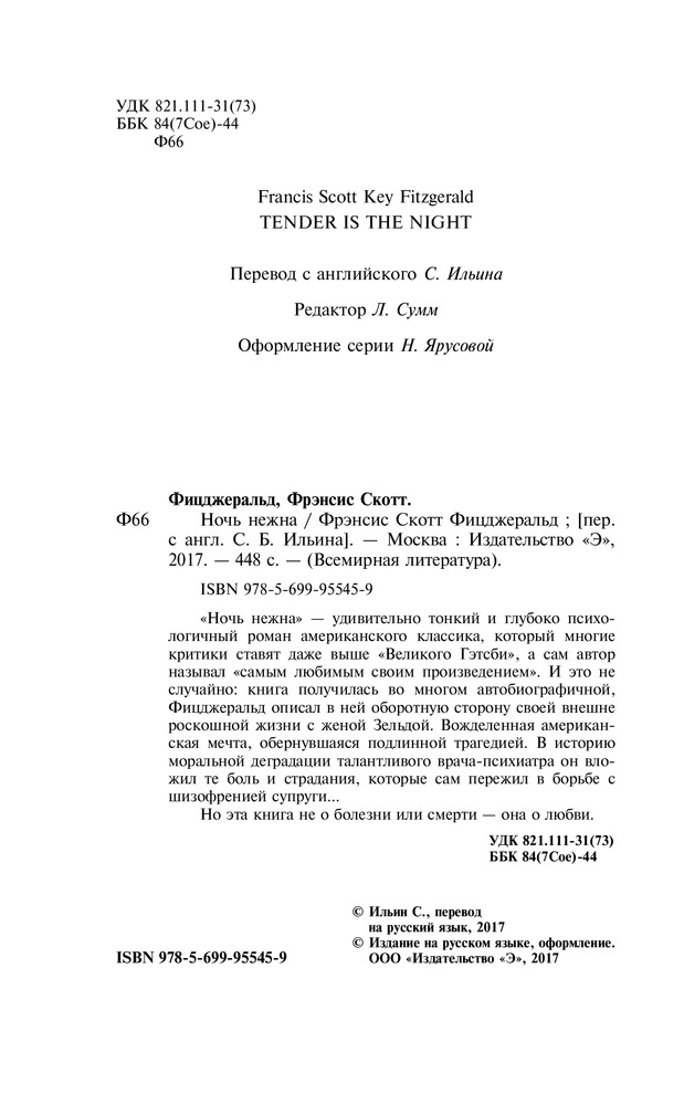 Ночь нежнаВ данный момент этот товар отсутствует в продаже. Возможно, у нас найдется аналогичный или похожий товар здесь. Серия: Всемирная литература «Ночь нежна» — удивительно тонкий и глубоко психологичный роман американского классика, который многие критики ставят даже выше «Великого Гэтсби», а сам автор называл «самым любимым своим произведением». И это не случайно: книга получилась во многом автобиографичной, Фицджеральд описал в ней оборотную сторону своей внешне роскошной жизни с женой Зельдой. Вожделенная американская мечта, обернувшаяся подлинной трагедией. В историю моральной деградации талантливого врача-психиатра он вложил те боль и страдания, которые сам пережил в борьбе с шизофренией супруги. |