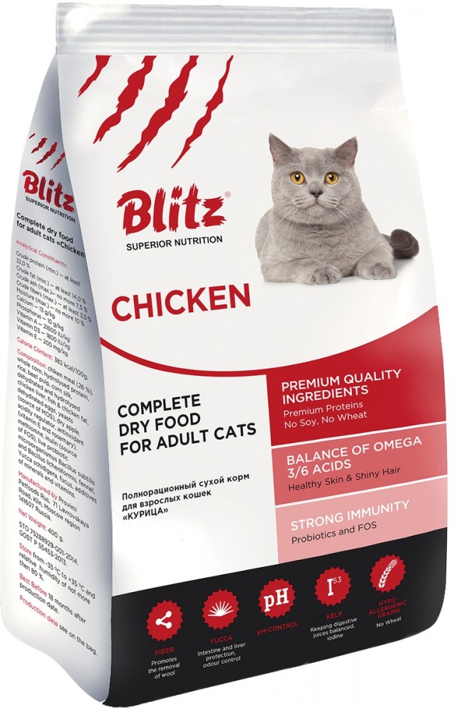Полнорационный сухой корм BLITZ для взрослых кошек всех пород на основе одного источника белка — курицы. Рацион удовлетворяет жизненные потребности взрослой кошки, обеспечивает крепкое здоровье и отличный внешний вид, способствует профилактике распространённых заболеваний, укрепляет иммунную систему вашего питомца. Оптимальное содержание мясных белков, жиров и энергии обеспечивают лучшую кондицию для взрослых кошек всех пород. Корм содержит витаминно-минеральный комплекс, обеспечивающий потребности взрослой кошки. Содержащиеся в корме пробиотики улучшают усвояемость корма и поддерживают иммунитет. Корм содержит ненасыщенные жирные кислоты Омега-3 и Омега-6, обеспечивающие иммунитет, здоровую кожу и отличную шерсть.