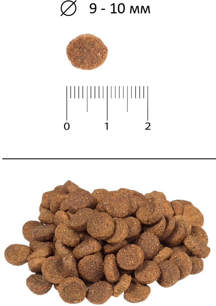 Состав: дегидрированное мясо курицы (26%), цельная кукуруза, рис, гидролизованный белок, сушёная мякоть свеклы, кукурузные рыльца, дегидратированная и гидролизованная куриная печень, рыбий и куриный жир, дегидратированное яйцо, дрожжи — источник мананноолигосахаридов (MOS), яблоко сушёное, регулятор кислотности, антиоксиданты (витамин Е и экстракт розмарина), метионин, инулин — фруктоолигосахарид (FOS), пробиотики — живые микроорганизмы Bacillus subtilis и Bacillus licheniformis, фенхель, юкка Шидигера, фукус, витамины и минералы. |