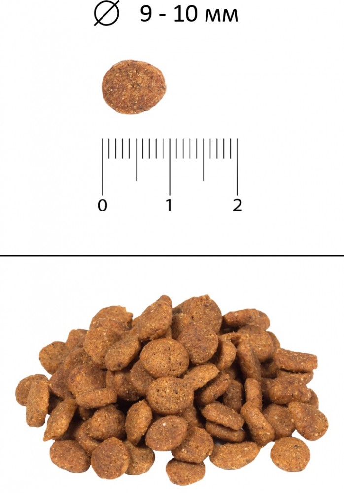 Состав: дегидрированное мясо индейки и курицы (27 %), цельная кукуруза, рис, гидролизованный белок, дегидратированная и гидролизованная куриная печень, сушёная мякоть свеклы, кукурузные рыльца, рыбий и куриный жир, дегидратированное яйцо, дрожжи — источник мананноолигосахаридов (MOS), яблоко сушёное, регулятор кислотности, антиоксиданты (витамин Е и экстракт розмарина), метионин, инулин — фруктоолигосахарид (FOS), пробиотики — живые микроорганизмы Bacillus subtilis и Bacillus licheniformis, фенхель, юкка Шидигера, фукус, витамины и минералы. |