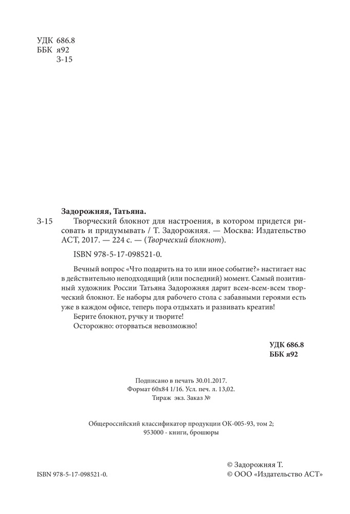 Творческий блокнот для настроения, в котором придется рисовать и придумыватьТатьяна Владимировна Задорожняя В данный момент этот товар отсутствует в продаже. Возможно, у нас найдется аналогичный или похожий товар здесь. Серия: Творческий блокнот Вечный вопрос «Что подарить на то или иное событие?» настигает нас в действительно неподходящий (или последний) момент. Самый позитивный художник России Татьяна Задорожняя дарит всем-всем-всем творческий блокнот. Ее наборы для рабочего стола с забавными героями есть уже в каждом офисе, теперь пора отдыхать и развивать креатив! |