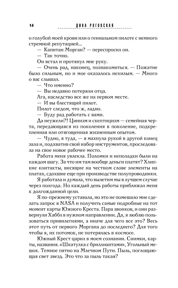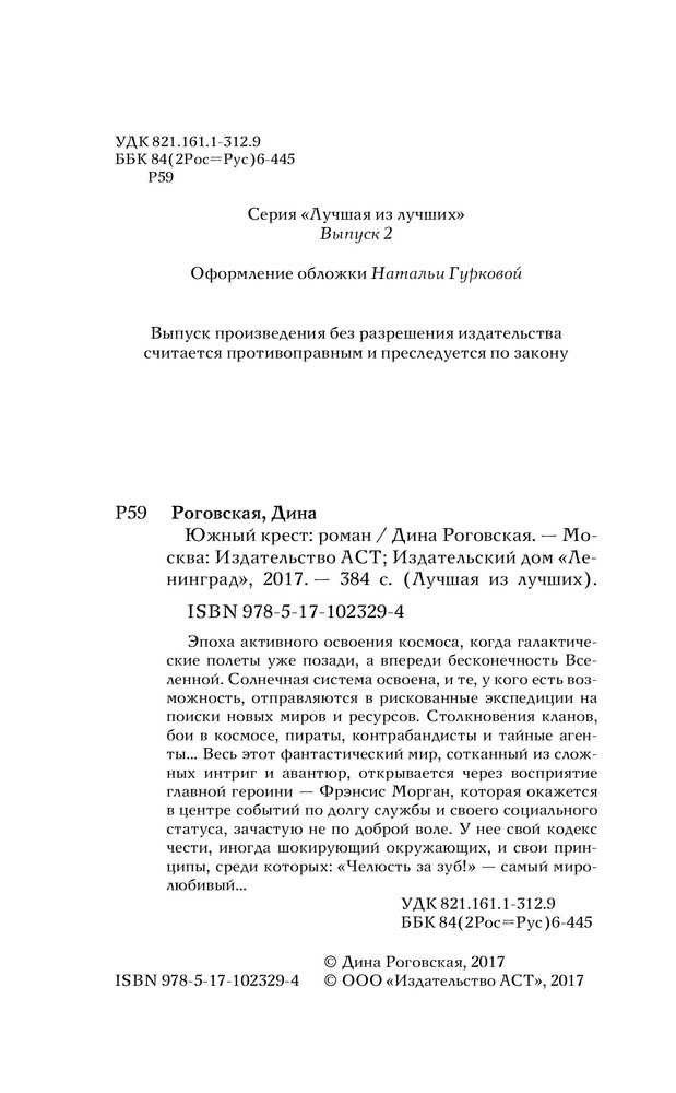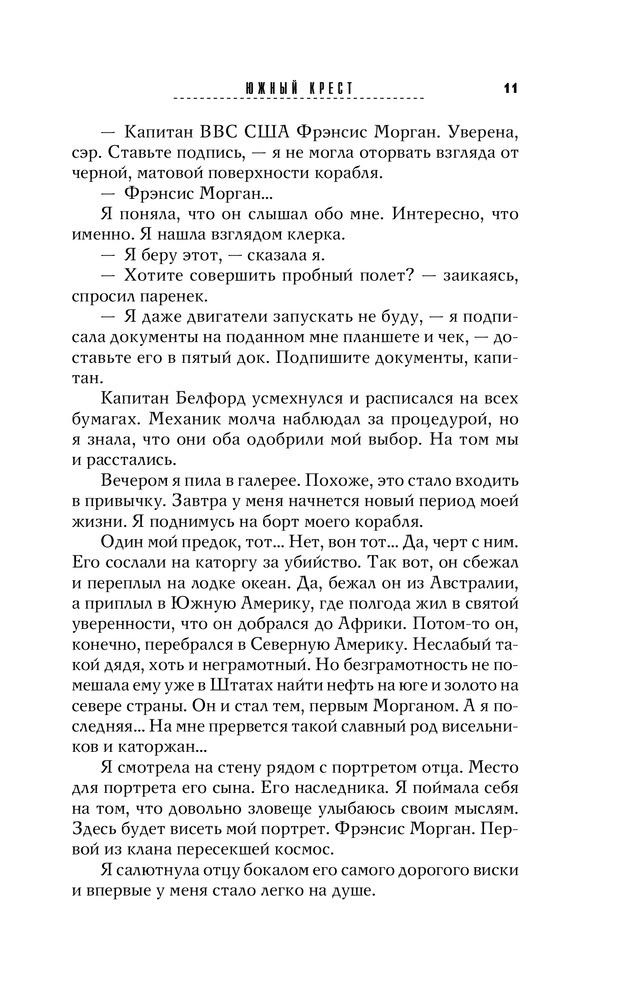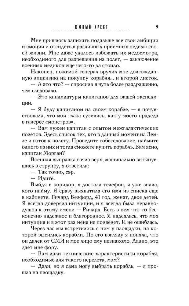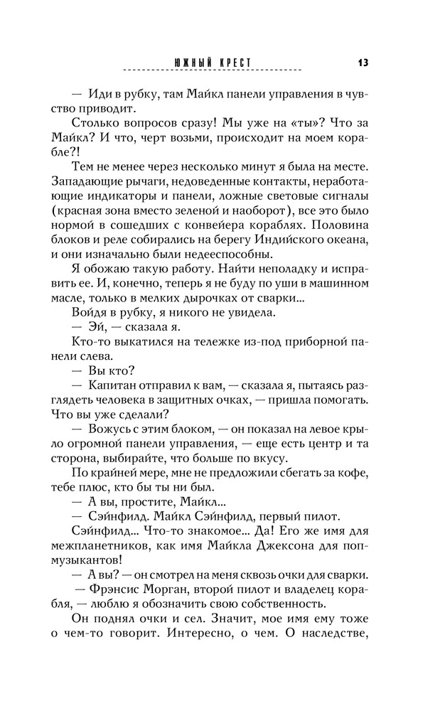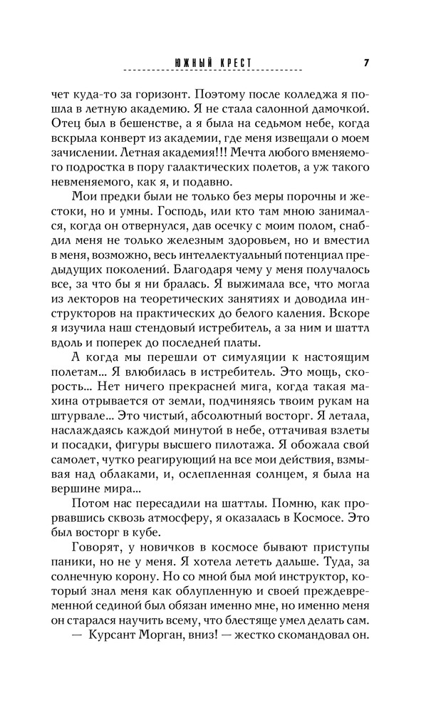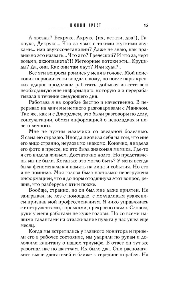Южный крестВ данный момент этот товар отсутствует в продаже. Возможно, у нас найдется аналогичный или похожий товар здесь. Серия: Лучшая из лучших Эпоха активного освоения космоса, когда галактические полеты уже позади, а впереди бесконечность Вселенной. Солнечная система освоена, и те, у кого есть возможность, отправляются в рискованные экспедиции на поиски новых миров и ресурсов. Столкновения кланов, бои в космосе, пираты, контрабандисты и тайные агенты... Весь этот фантастический мир, сотканный из сложных интриг и авантюр, открывается через восприятие главной героини — Фрэнсис Морган, которая окажется в центре событий по долгу службы и своего социального статуса, зачастую не по доброй воле. У нее свой кодекс чести, иногда шокирующий окружающих, и свои принципы, среди которых: «Челюсть за зуб!» — самый миролюбивый... |