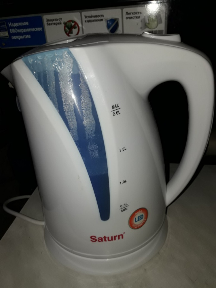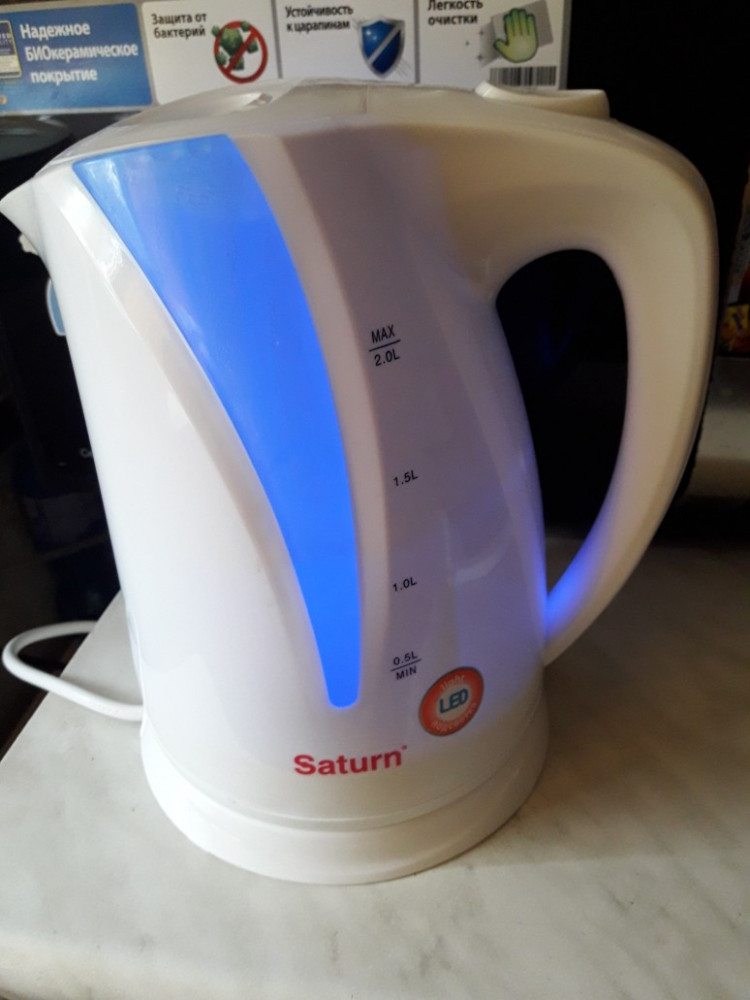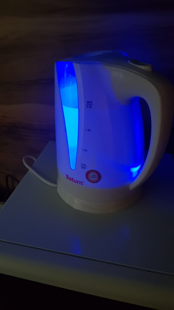 Чайничек просто супер. Именно чайничек. Не смотря на белый цвет, смотрится очень небольшим. Даже не верилось, что он 2 литра, пришлось измерить. Небольшой запах пропал после первого кипячения. Вода льется тонкой струйкой, что очень удобно для кипятка. И радует гарантия на 2 года. Пластмасса очень достойная. Цена супер. Семья довольна, он понравился всем. Подсветка очень яркая, видно прекрасно уровень воды. Единственный минус - это шкала, расположенная только с одной стороны. Но это на любителя