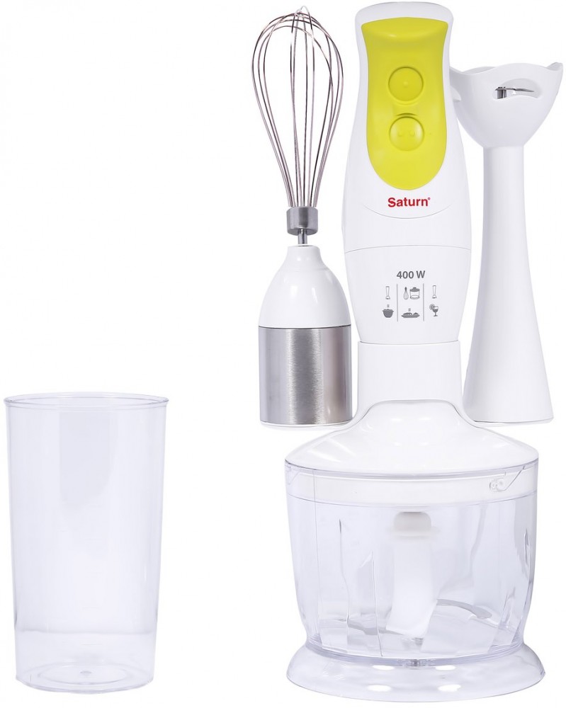 Блендер поставляется в комплекте с аксессуарами, которые включают в себя чоппер из качественного пищевого пластика и острыми ножами, насадку-венчик из нержавеющей стали и мерный пластиковый стакан.