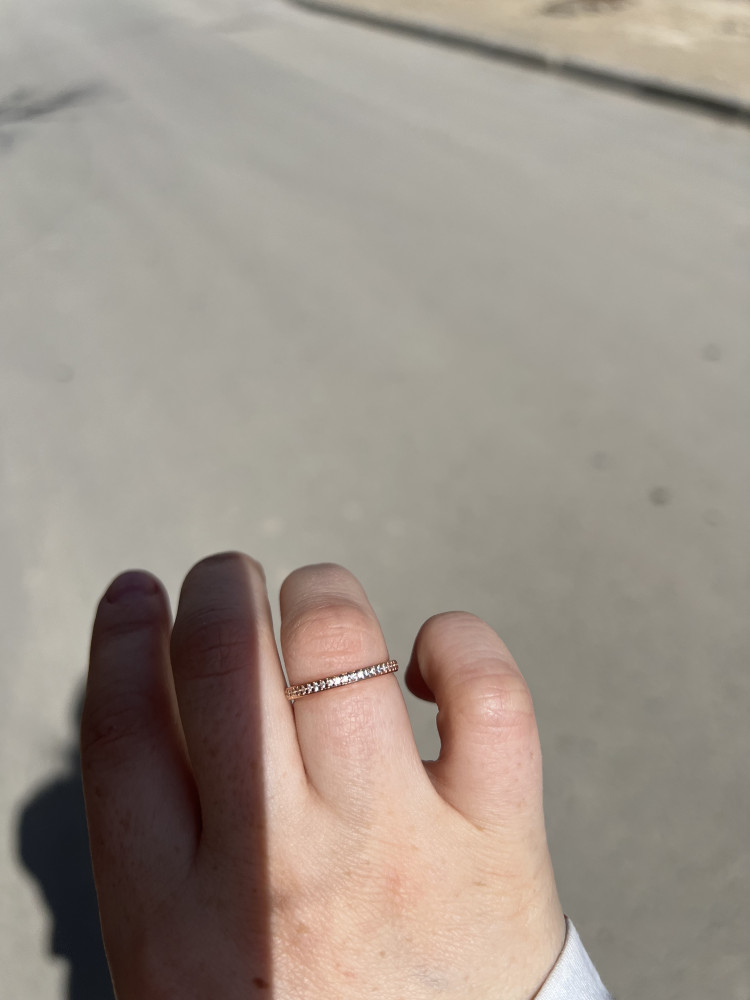 Колечко тоненькое, нежное, красивое. Заказала 15 размер на мизинец. Немного маломерит.