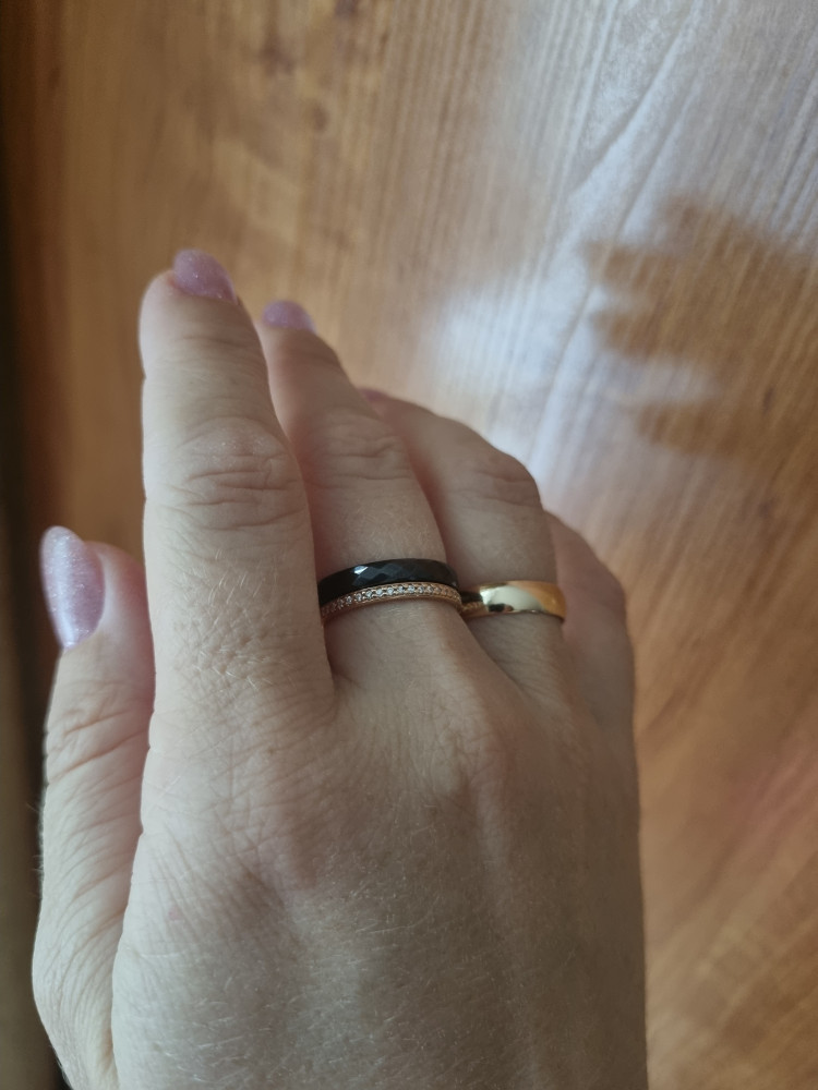 специально искала такое тоненькое колечко, чтобы носить в комплекте с чёрным керамическим колечком. Подошло идеально!