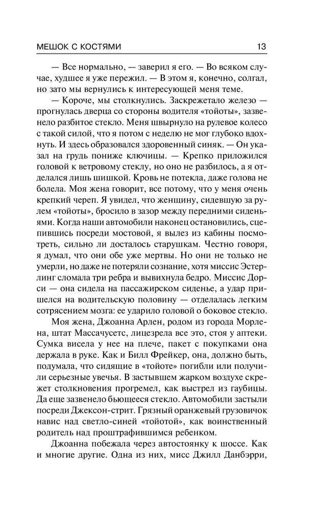 У этой книги интересно закрученный сюжет. Кинг знает свое дело, медленно и постепенно ты погружаешься в захватывающую, призрачную атмосферу, наводящую жуть. Кроме жути "Мешок с костями"- это интригующая, детективная история. Итак... После странной смерти своей беременной жены, писатель Майк Нунэн отправляется в их старый дом у озера, в надежде найти потерянное вдохновение. В этом доме творится нечто пугающе, странное. Майк становится свидетелем кое-чего невероятного... Читайте книгу Стивена Кинга "Мешок с костями". Спасибо за внимание }:D