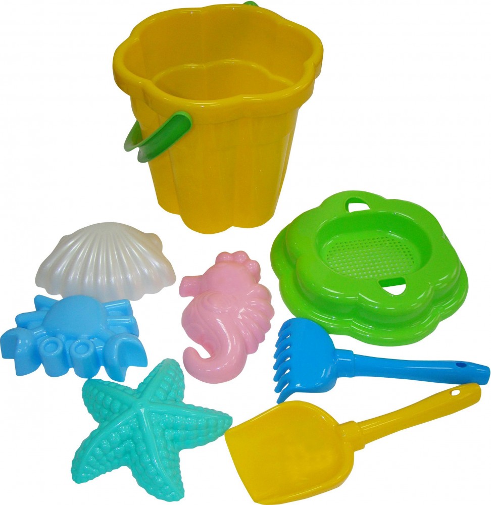 Комплектация: ведро-цветок большое, ситечко-цветок большое, лопатка №5, грабельки №5, формочки (краб №1 + морской конёк + морская звезда №1 + ракушка №1).