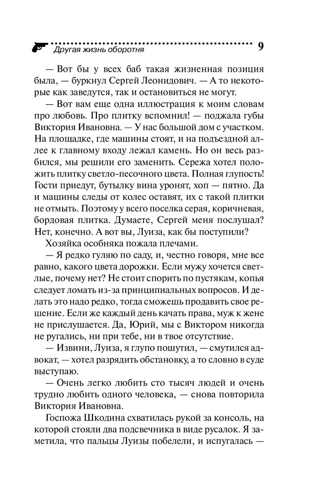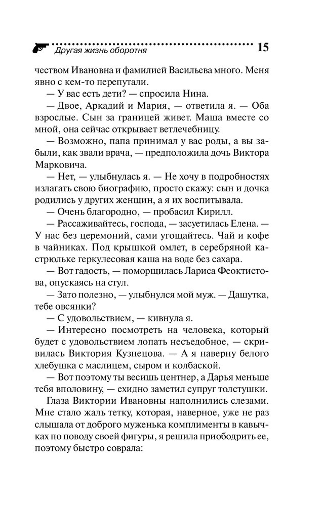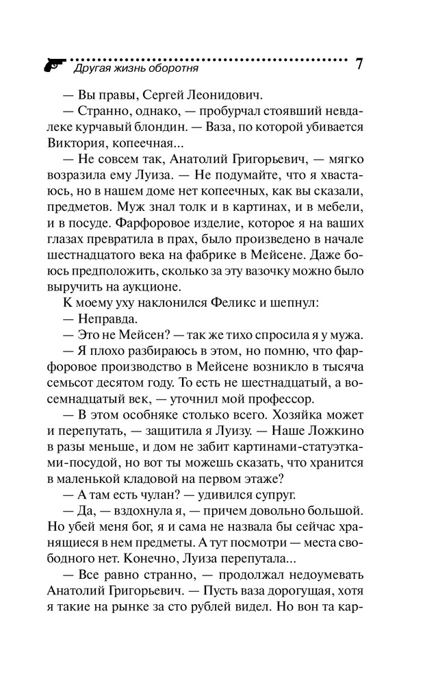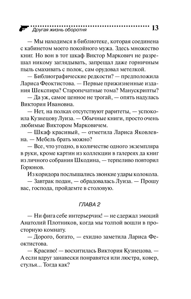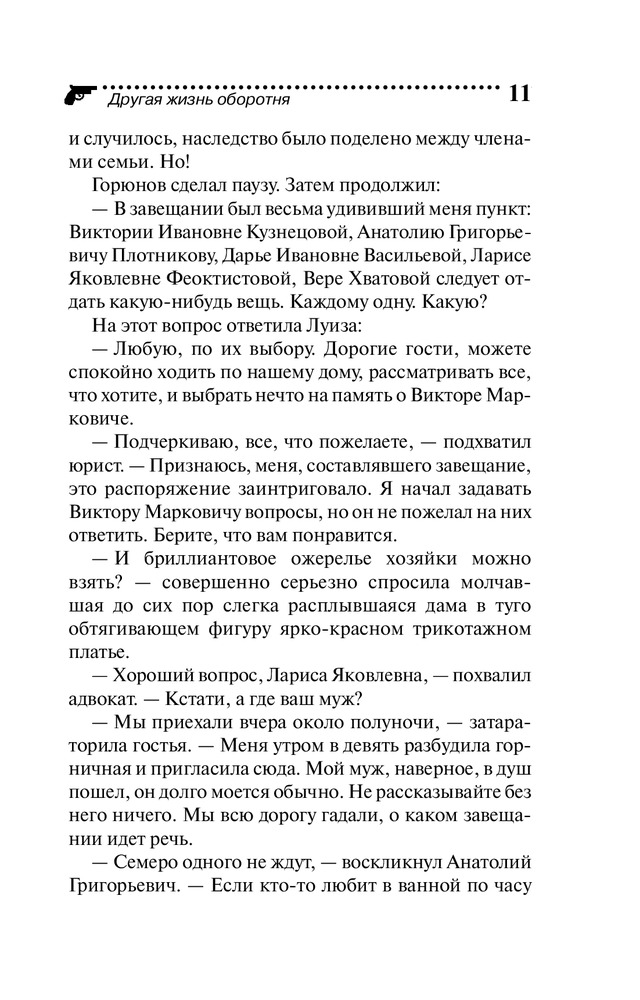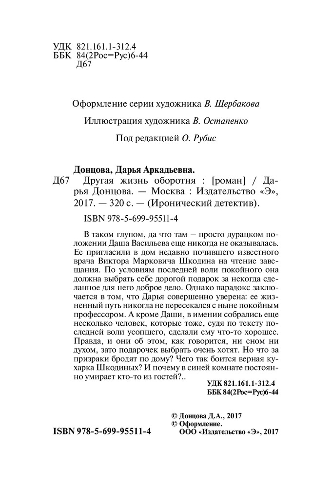Другая жизнь оборотняВ данный момент этот товар отсутствует в продаже. Возможно, у нас найдется аналогичный или похожий товар здесь. Серия: Иронический детектив (мяг) Донцова В таком глупом, да что там — просто дурацком положении Даша Васильева еще никогда не оказывалась. Ее пригласили в дом недавно почившего известного врача Виктора Марковича Шкодина на чтение завещания. По условиям последней воли покойного, она должна выбрать себе дорогой подарок за некогда сделанное для него доброе дело. Однако парадокс заключается в том, что Дарья совершенно уверена: ее жизненный путь никогда не пересекался с ныне покойным профессором. А кроме Даши в имении собрались еще несколько человек, которые тоже, судя по тексту последней воли усопшего, сделали ему что-то хорошее. Правда, и они об этом, как говорится, ни сном ни духом, зато подарочек выбрать очень хотят. Но что за призраки бродят по дому? Чего так боится верная кухарка Шкодиных? И почему в синей комнате постоянно умирает кто-то из гостей? |
