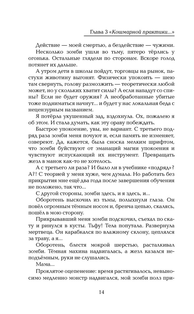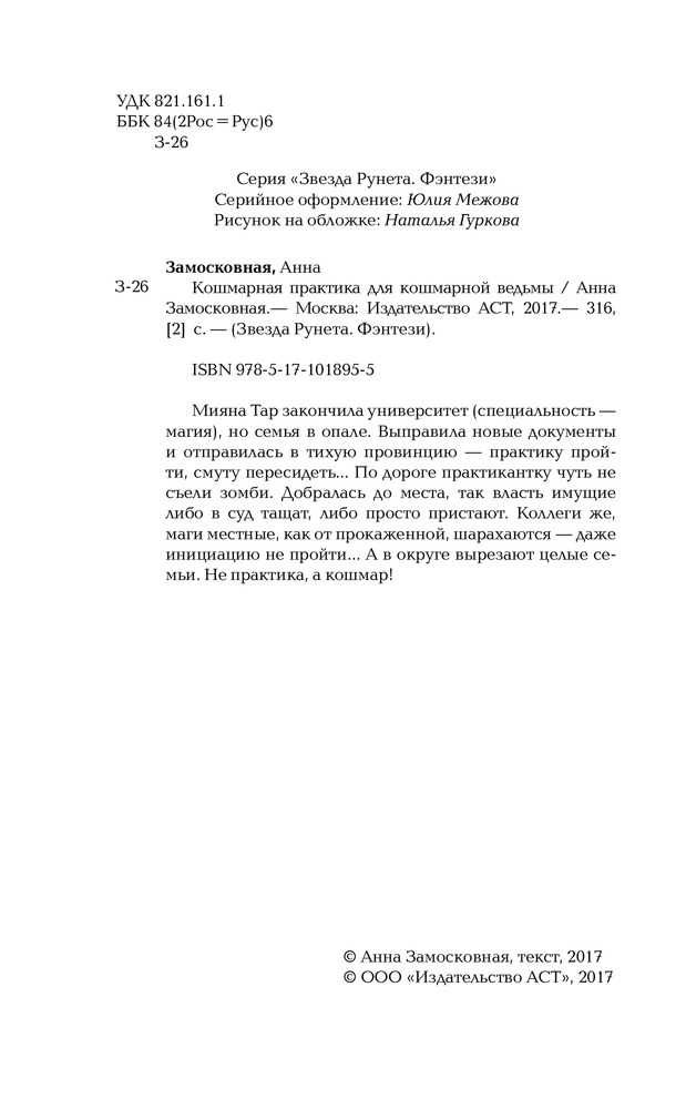 Кошмарная практика для кошмарной ведьмыВ данный момент этот товар отсутствует в продаже. Возможно, у нас найдется аналогичный или похожий товар здесь. Серия: Звезда Рунета. Фэнтези Мияна Тар закончила университет (специальность — магия), но семья в опале. Выправила новые документы и отправилась в тихую провинцию — практику пройти, смуту пересидеть... По дороге практикантку чуть не съели зомби. Добралась до места, так власть имущие либо в суд тащат, либо просто пристают. Коллеги же, маги местные, как от прокаженной, шарахаются — даже инициацию не пройти... А в округе вырезают целые семьи. Не практика, а кошмар! |