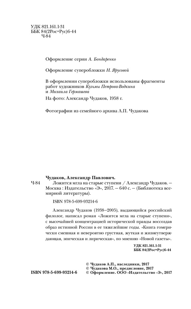 Ложится мгла на старые ступениВ данный момент этот товар отсутствует в продаже. Возможно, у нас найдется аналогичный или похожий товар здесь. Серия: Библиотека Всемирной Литературы Александр Чудаков (1938–2005), выдающийся российский филолог, написал роман «Ложится мгла на старые ступени», с высочайшей концентрацией исторической правды воссоздав образ истинной России в ее тяжелейшие годы. «Книга гомерически смешная и невероятно грустная, жуткая и жизнеутверждающая, эпическая и лирическая», по мнению «Новой газеты». |
