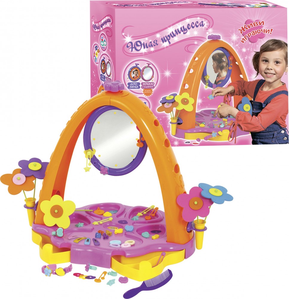 Настольный игровой комплекс для девочек с украшениями и парикмахерскими принадлежностями. Комплекс оснащен зеркалом с подсветкой, двумя вазочками, двумя выдвижными полочками. С обратной стороны зеркала - фото-рамка для любимой фотографии маленькой красавицы. Вазочки заполняются сборными цветочками (5шт.).