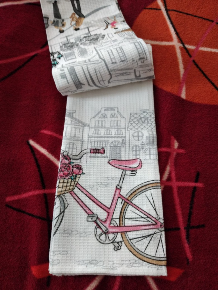 Полотенца классные, качество замечательное, заказывала под интерьер кухни! Полотенце, на котором нарисованы велосипеды, разрезала пополам и получила 2 полотенца. Всем нравится, правда, говорят, что жалко вытирать руки такой красотой :)