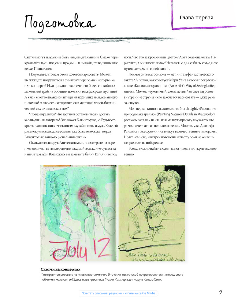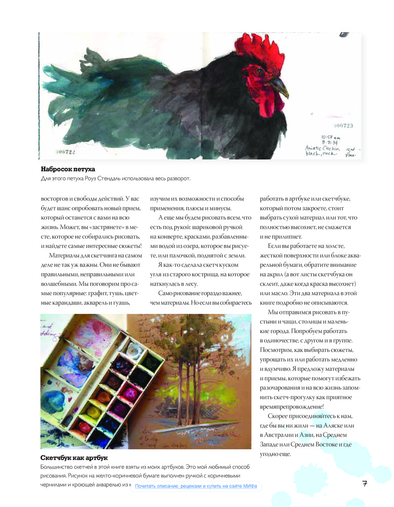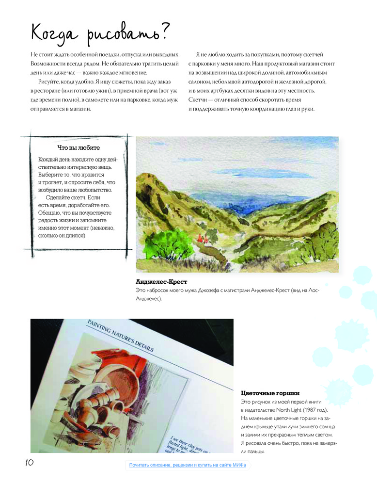 Скетчбук художника. Скетчи в городе, в путешествиях, на природеВ данный момент этот товар отсутствует в продаже. Возможно, у нас найдется аналогичный или похожий товар здесь. Серия: МИФ. Творчество Продолжение книги Джонсон «Артбук» о том, как превратить окружающие предметы и объекты, эмоции, впечатления и даже запахи в зрительные воспоминания. В этой книге Кэти Джонсон и другие художники показывают любимые уголки природы, здания, звук волн и любимых домашних животных в своих альбомах. Кэти делится советами и умениями, как превратить скетчинг в приятное и «продуктивное» занятие. Эти 128 страниц — своего рода введение в рисование. Это не структурированный курс, но в книге множество советов, касающихся рисования. В частности, речь идет о различных типах предметов, которые можно нарисовать. В отличие от других книг по скетчингу, эта книга больше ориентирована на рисование природы, особенно много примеров пейзажей, животных, растений. Есть также примеры зданий, детали архитектуры, но в меньшей степени, хотя есть глава и об этом. А также страницы, демонстрирующие процесс создания цветного эскиза. Хорошая книга с примерами, которые покажут вам, как можно делать скетчи и сохранять воспоминания, зарисовывая их. |