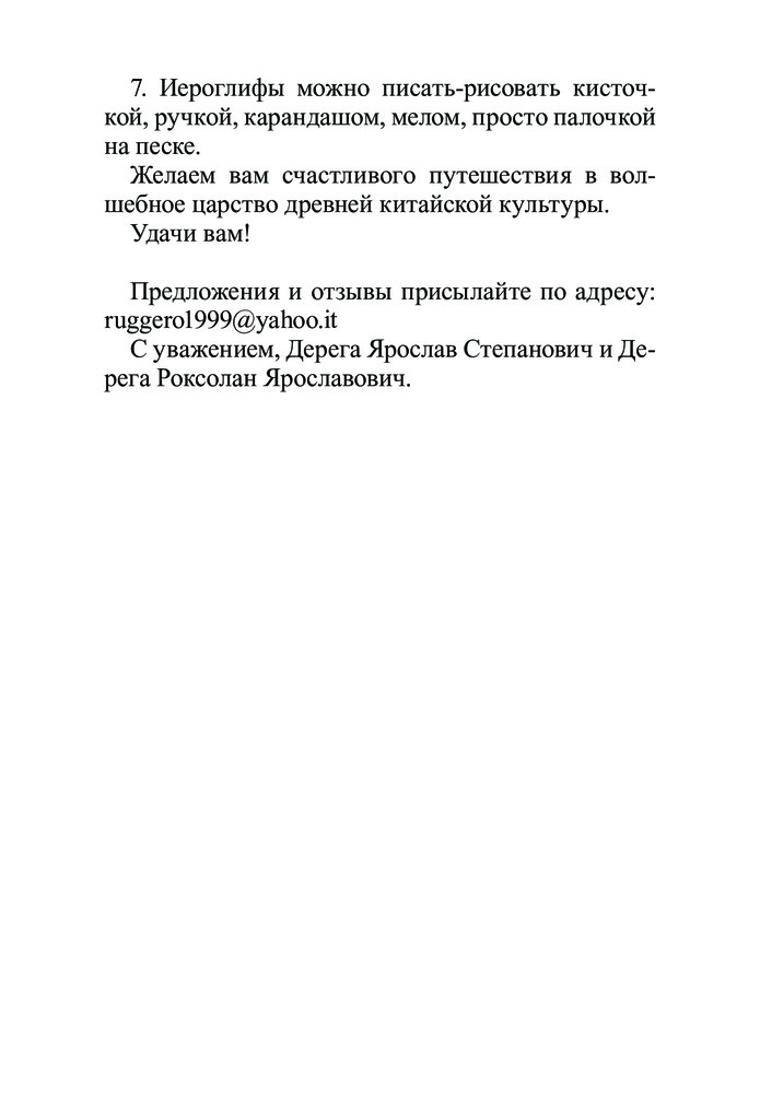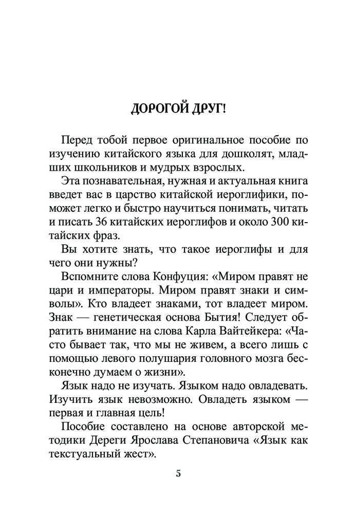 Мой первый китайскийВ данный момент этот товар отсутствует в продаже. Возможно, у нас найдется аналогичный или похожий товар здесь. Это первый в мире учебник китайского языка для дошколят и младших школьников, составленный на основе авторской методики Ярослава Дереги, которая прошла испытание в Кембриджском университете в качестве первой естественной системы изучения иностранных языков. Познавательная, нужная, актуальная книга, доступная для всех детей и начинающих изучать язык взрослых. Она введет вас в мир китайской каллиграфии, поможет легко и быстро научиться понимать, читать и писать 36 китайских иероглифов и около 300 китайских фраз. Для каждого иероглифа в учебнике приводятся прописи-образцы и предусмотрено свободное место для выполнения упражнений и рисования прямо в книге. |
