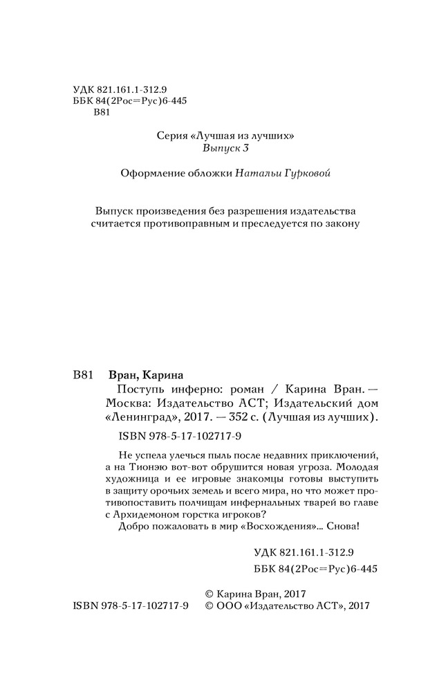 Поступь инферноВ данный момент этот товар отсутствует в продаже. Возможно, у нас найдется аналогичный или похожий товар здесь. Серия: Лучшая из лучших Не успела улечься пыль после недавних приключений, а на Тионэю вот-вот обрушится новая угроза. Молодая художница и ее игровые знакомцы готовы выступить в защиту орочьих земель и всего мира, но что может противопоставить полчищам инфернальных тварей во главе с Архидемоном горстка игроков? |