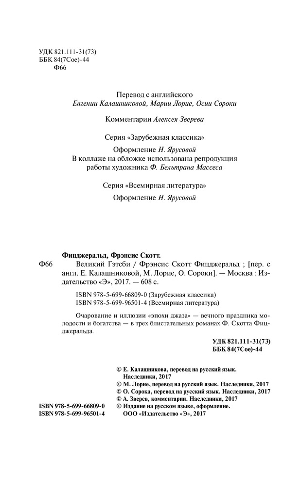 Великий ГэтсбиВ данный момент этот товар отсутствует в продаже. Возможно, у нас найдется аналогичный или похожий товар здесь. Серия: Всемирная литература Очарование и иллюзии «эпохи джаза» — вечного праздника молодости и богатства — в трех блистательных романах Ф. Скотта Фицджеральда. |