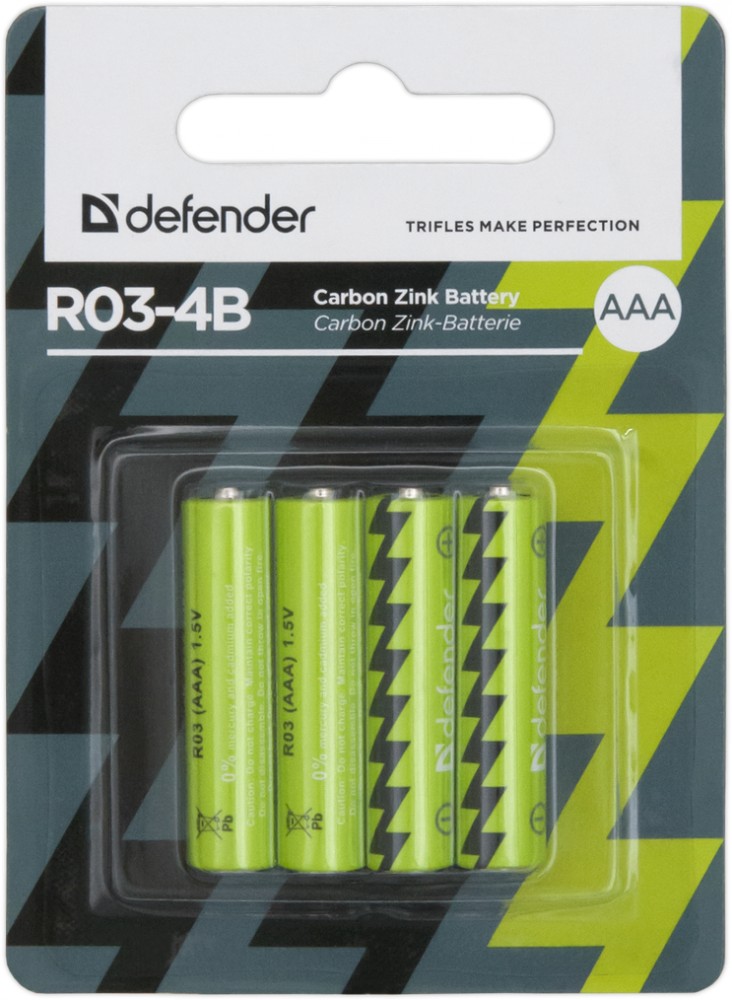 Defender Батарея солевая R03 AAA «Defender» R03-4B, 4 штукиВ данный момент этот товар отсутствует в продаже. Возможно, у нас найдется аналогичный или похожий товар здесь. Идеально подходит для питания бытовых устройств со стандартным энергопотреблением, таких как часы, радиоприемники, пульты ДУ, плееры, диктофоны, электробритвы, весы, фотоаппараты, компьютерные мыши, фонари, радиостанции и пр. Возможность продолжительного хранения до начала эксплуатации без потери качества. Долговечные элементы питания показывают отличный результат в различных электронных устройствах, в том числе беспроводных. |