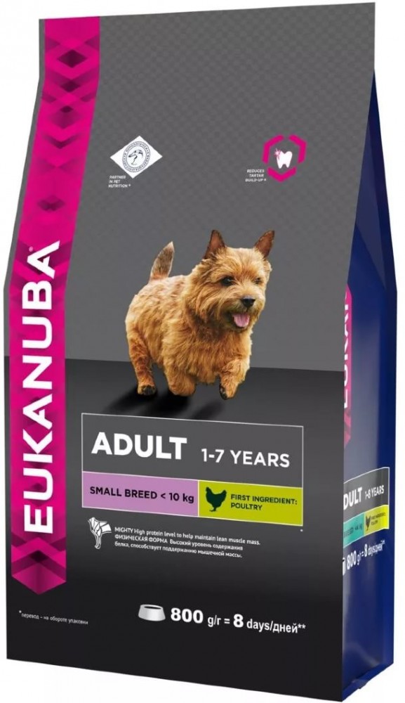 Корм содержит на 8% больше белков и на 20% больше жиров*, он идеально подходит для ускоренного обмена веществ и маленьких желудков собак мелких пород. (*по сравнению с Eukanuba Dog Adult для средних пород)