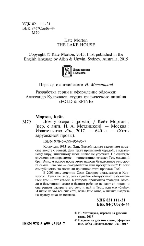 Дом у озераВ данный момент этот товар отсутствует в продаже. Возможно, у нас найдется аналогичный или похожий товар здесь. Серия: Хиты зарубежной прозы (обл) Корнуолл, 1933 год. Элис Эдевейн живет в красивом поместье вместе с семьей. Дни текут привычной чередой, а идеальному миру, лишенному забот, ничто не угрожает. Но однажды случается непоправимое — таинственно исчезает Тео, младший брат Элис. А вскоре после этого находят бездыханное тело друга семьи. Что это — самоубийство или преступление? И если самоубийство, то могла ли причиной стать пропажа Тео? |