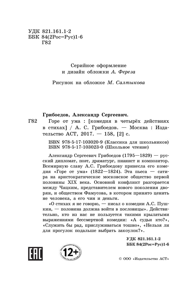 💳 Оплатить за товар можно при получении 🇰🇿 Есть бесплатная доставка по Казахстану от 1 дня 🎁 Копите бонусы с каждой покупки Серия: Школьное чтение Александр Сергеевич Грибоедов (1795 — 1829) — русский дипломат, поэт, драматург, пианист и композитор. Всемирную славу А.С. Грибоедову принесла его комедия «Горе от ума» (1822-1824). Эта пьеса — сатира на аристократическое московское общество первой половины ХIХ века. Основной конфликт разгорается между Чацким, представителем нового поколения дворян, и обществом Фамусова, в котором принято ценить не человека, а его чин и деньги. |