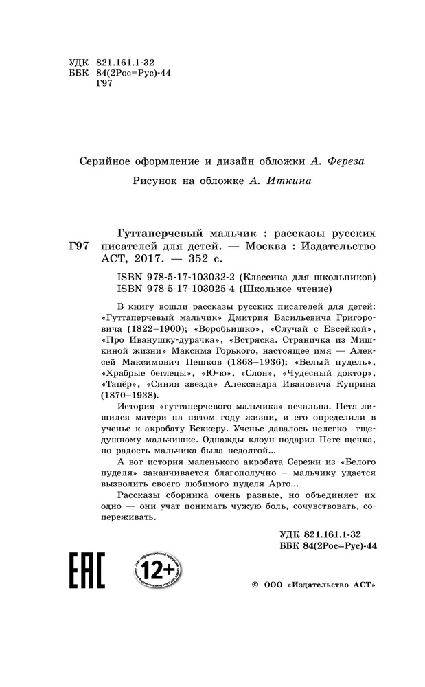 💳 Оплатить за товар можно при получении 🇰🇿 Есть бесплатная доставка по Казахстану от 1 дня 🎁 Копите бонусы с каждой покупки Серия: Классика для школьников В книгу вошли рассказы русских писателей для детей: «Гуттаперчевый мальчик» Дмитрия Васильевича Григоровича (1822 – 1900); «Воробьишко», «Случай с Евсейкой», «Про Иванушку-дурачка», «Встряска. Страничка из Мишкиной жизни» Максима Горького, настоящее имя – Алексей Максимович Пешков (1868 – 1936); «Белый пудель», «Храбрые беглецы», «Ю-ю», «Слон», «Чудесный доктор», «Тапёр», «Синяя звезда» Александра Ивановича Куприна (1870 – 1938). |