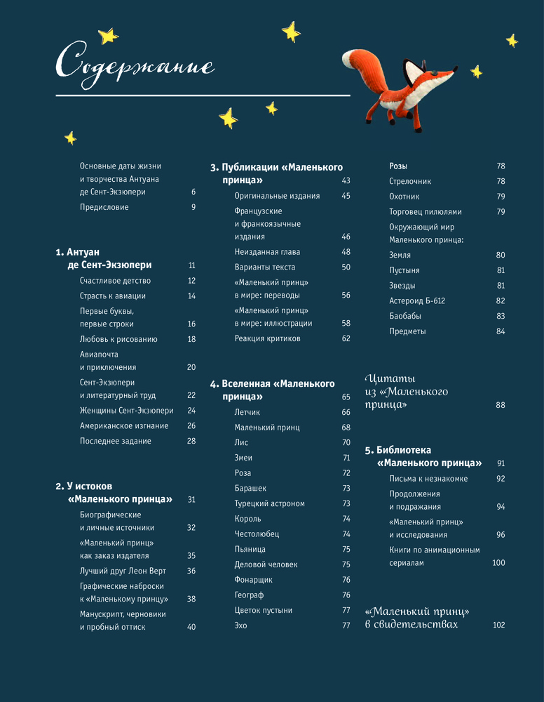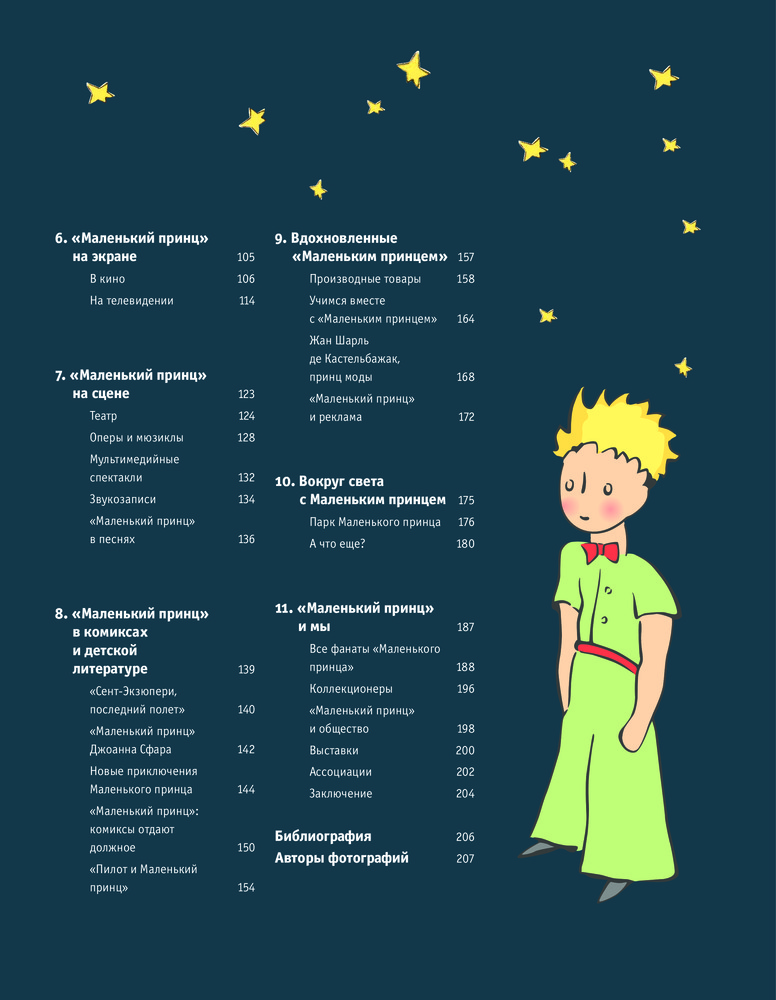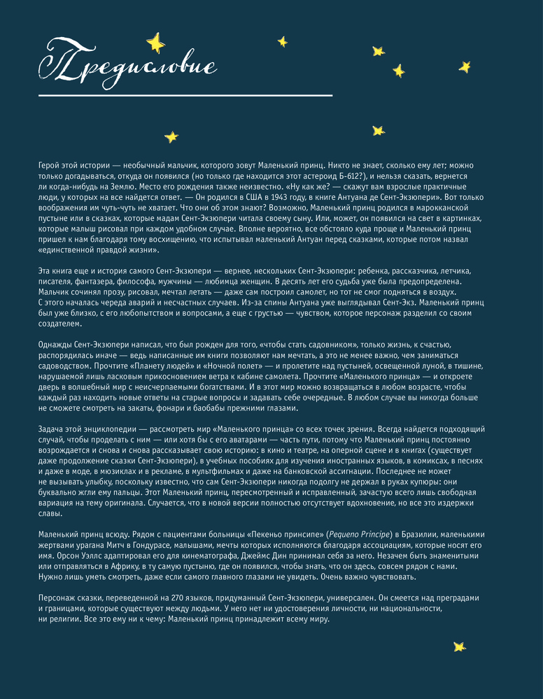 Впервые в одной книге представлена вся летопись «Маленького принца»: с момента появления в 1943 году до последующих и современных воплощений произведения в мировой культуре: в книгах, кинофильмах, мультфильмах, спектаклях, песнях, комиксах, товарах и сувенирах.