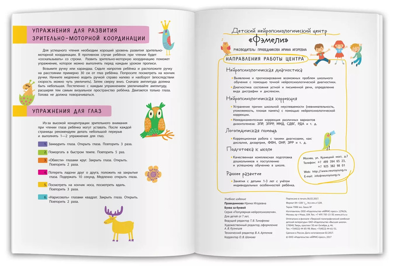 Нейропсихологические прописи. Буква за буквойВ данный момент этот товар отсутствует в продаже. Возможно, у нас найдется аналогичный или похожий товар здесь. Серия: Популярная нейропсихология Ваш ребёнок спотыкается при чтении слогов, переставляет буквы, заменяет окончания и додумывает слова? Такое чтение называют "угадывающим". Это явление довольно частое при обучении детей. Почему это происходит? Дело в том, что, когда мы читаем, работает сразу несколько зон в структурах коры головного мозга. Угадывающее чтение - это показатель их недосформированности, нарушения связей. Нейропсихологическая тетрадь содержит упражнения, ориентированные на устранение основных причин "угадывающего чтения". Ребёнок в игровой форме учится преодолевать мысленное додумывание, соблюдать последовательность чтения и правильно понимать прочитанное. Упражнения начинаются с чтения простых знакомых слов и постепенно усложняются. Задания в тетради воспринимаются как игра, и дети выполняют их с удовольствием. Ребёнку понятно, что делать в каждом задании, поэтому он может заниматься самостоятельно. Тетрадь рассчитана на 23 урока по 5 заданий в каждом. Занятия рекомендуется проводить 2-3 раза в неделю. Дополнительно автор предлагает комплекс упражнений для глаз, который позволит снять усталость и укрепить зрение. |