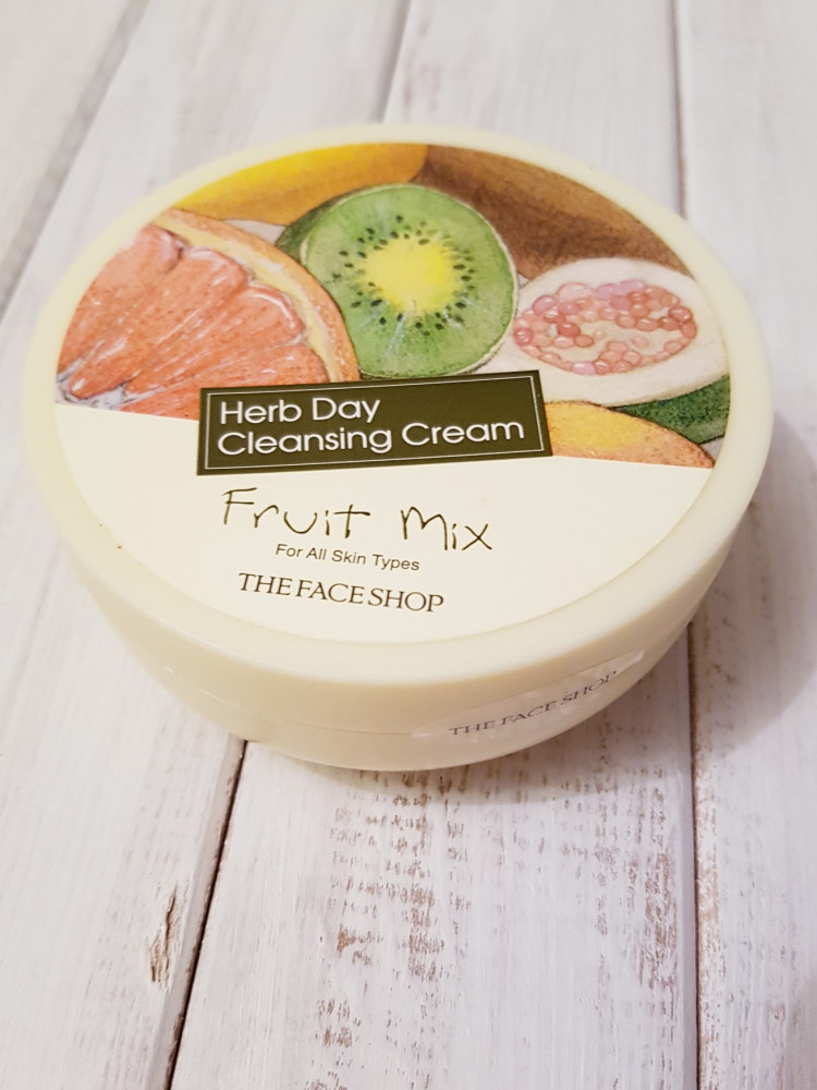 Крем для снятия макияжа «Cleansing Cream Fruit Mix», действительно кремовая текстура, нежная, с запахом грейпфрута. Использую так: сначала наношу небольшое количество крема на сухую кожу лица, легкими круговыми движениями массирую кожу сухими же руками, затем, смочив руки теплой водой, продолжаю массаж еще какое-то время. Крем становится похож на эмульсию. После смываю крем. Иногда, в зависимости от состояния кожи, дополнительно умываюсь пенкой. Кожа жирная, зрелая, купероз. По свойствам крем соответствует описанию. Внешний вид: пластиковая банка, внутри тонкая мембрана.