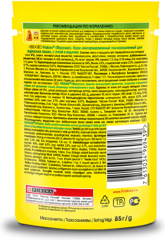 Friskies Корм влажный для кошек «Утка в подливе»В данный момент этот товар отсутствует в продаже. Возможно, у нас найдется аналогичный или похожий товар здесь. Условия хранения товара: температурный режим от -10 до +25°С. |