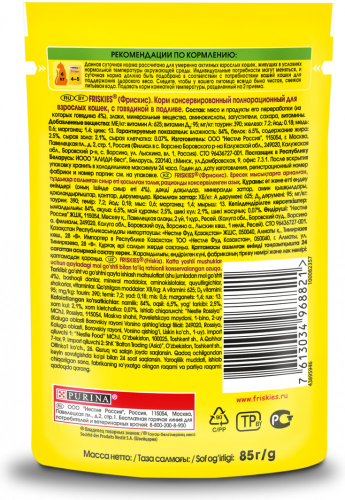 Отличный корм для кошки (Серия: Friskies, говядина). Кошка ела с великим удовольствием! Спасибо Вам!