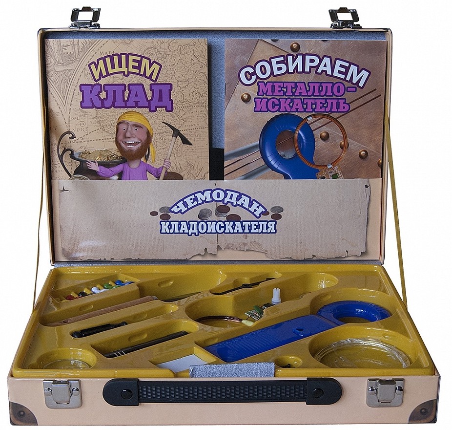 Ты сможешь сделать из проволоки рамку для поиска клада и испробовать ее на практике. А еще в этом чемодане есть игры для юных кладоискателей, а также интересные истории о самых знаменитых кладах. Будет весело и интересно!