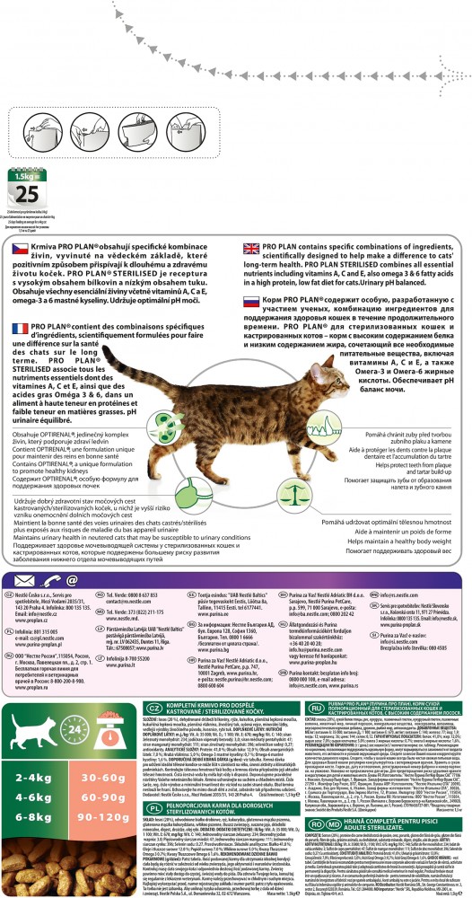 Для поддержания здоровья стерилизованных кошек. PRO PLAN® Sterilised сочетает все основные питательные вещества, включая витамины A, C и E и жирные кислоты омега-3 и омега-6, в богатой белками, нежирной рецептуре, которая также помогает обеспечить сбалансированный уровень pH мочи.