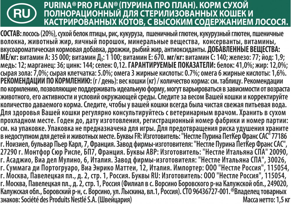 | Purina Корм для стерилизованных кошек и кастрированных котов «Pro Plan», с лососем (1,5 кг)
