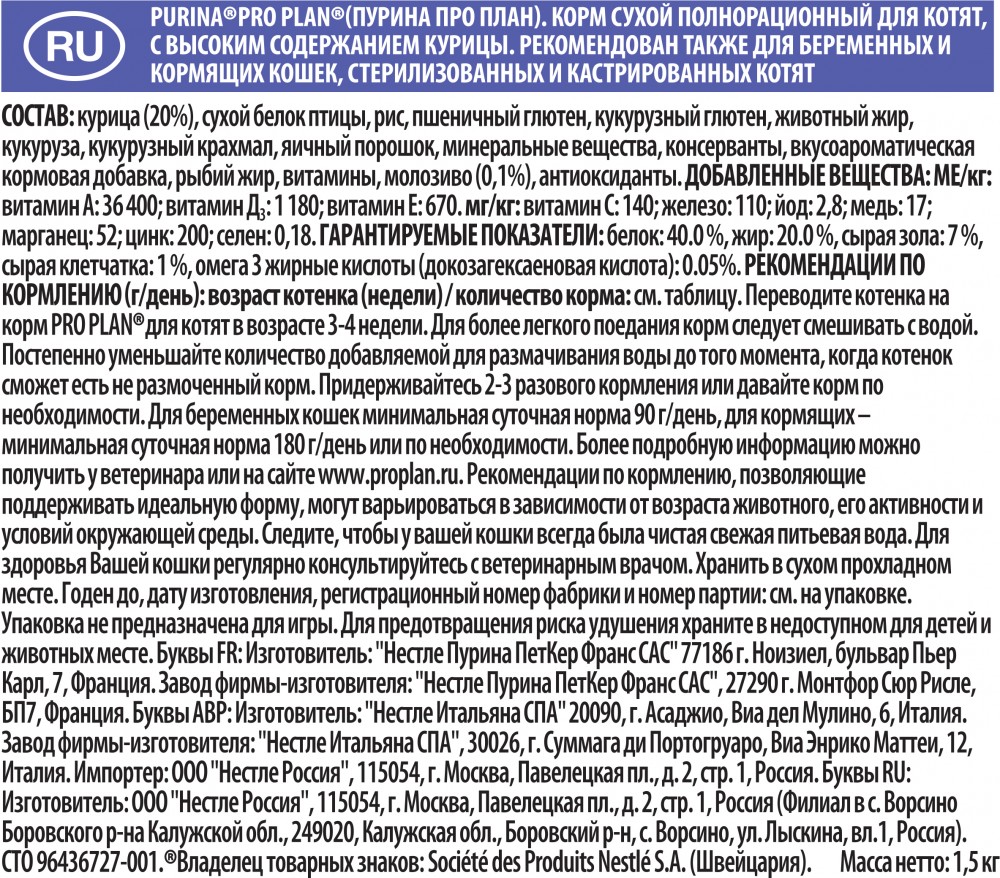 Получили корм для котов до 1 года Purina Pro Plan®. Понравился состав, который содержит все питательные вещества, необходимые для котов: высокое содержание белка, сочетающий все необходимые питательные вещества, включая витамины С и Д3, а так же Омега 3 жирную кислоту. Легко усвояемый корм для котов с чувствительным пищеварением. У кота от продукта только положительные впечатление. Котейка счастлив, активный. Рекомендую!