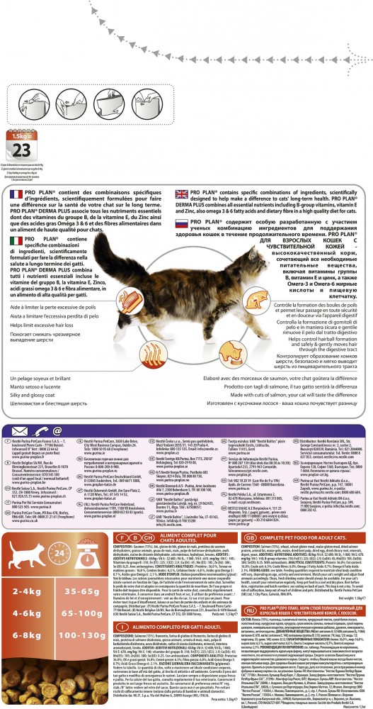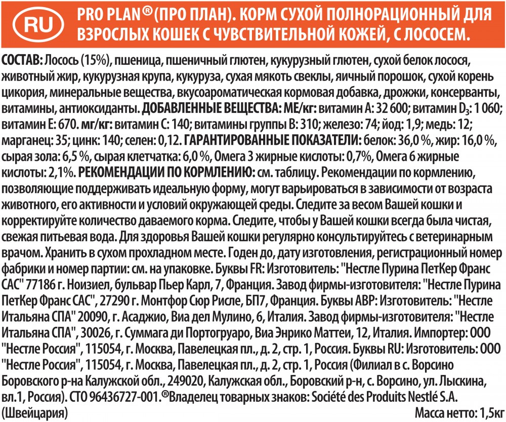 | Purina Корм для кошек с чувствительной кожей «Pro Plan», с лососем (1,5 кг)