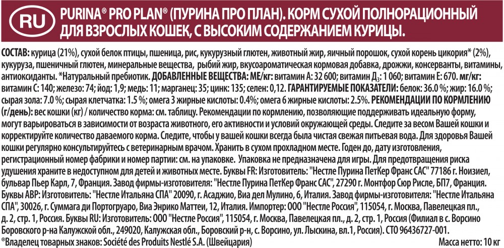 Purina Pro Plan Корм для взрослых кошек с курицей