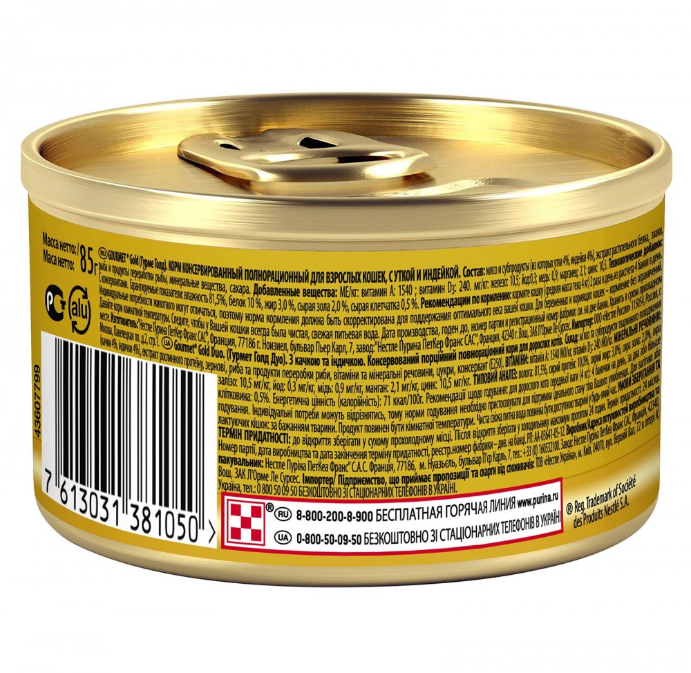 Gourmet Корм для кошек «С уткой и индейкой»В данный момент этот товар отсутствует в продаже. Возможно, у нас найдется аналогичный или похожий товар здесь. Серия: Gourmet Gold Условия хранения товара: температурный режим от -10 до +25°С. |