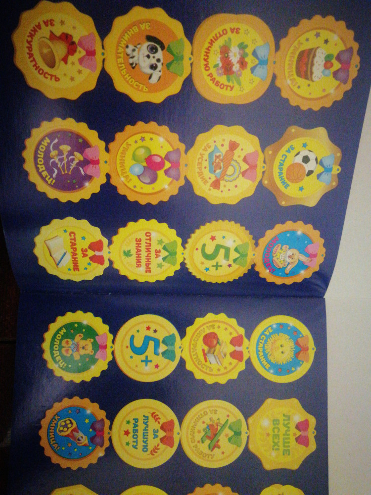 Много поощрительных наклеек в виде медалей🏅, хорошее качество. Спасибо большое👍