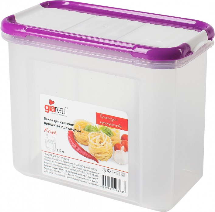Giaretti Банка для сыпучих продуктов с дозатором «Krupa» (1 л), черничныйВ данный момент этот товар отсутствует в продаже. Возможно, у нас найдется аналогичный или похожий товар здесь. Серия: Krupa Банки для сыпучих продуктов предназначены для хранения круп, сахара, макаронных изделий, сладостей и т.п., в том числе для продуктов с ярким ароматом (специи и пр.). Строгая прямоугольная форма банок поможет Вам организовать пространство максимально комфортно, не теряя полезную площадь. При этом банки устанавливаются одна на другую, что способствует экономии пространства в Вашем шкафу. Плотная крышка не пропускает запахи, и они не смешиваются в Вашем шкафу. Благодаря разнообразным отверстиям в дозаторе, Вам будет удобно насыпать как мелкие, так и крупные сыпучие продукты, что сделает процесс приготовления пищи проще. |