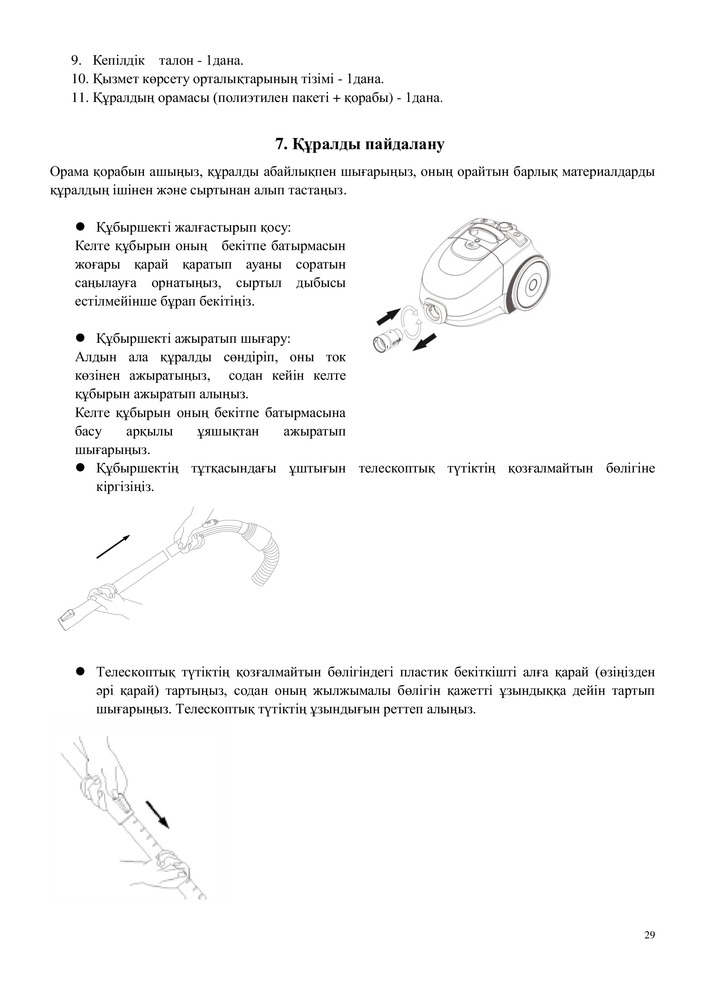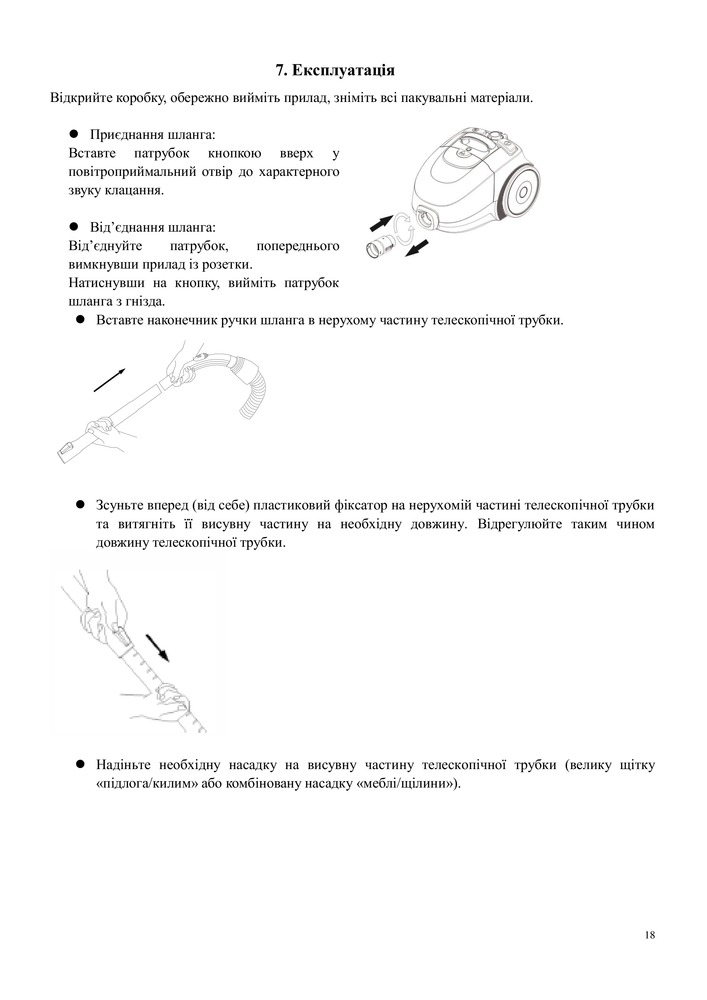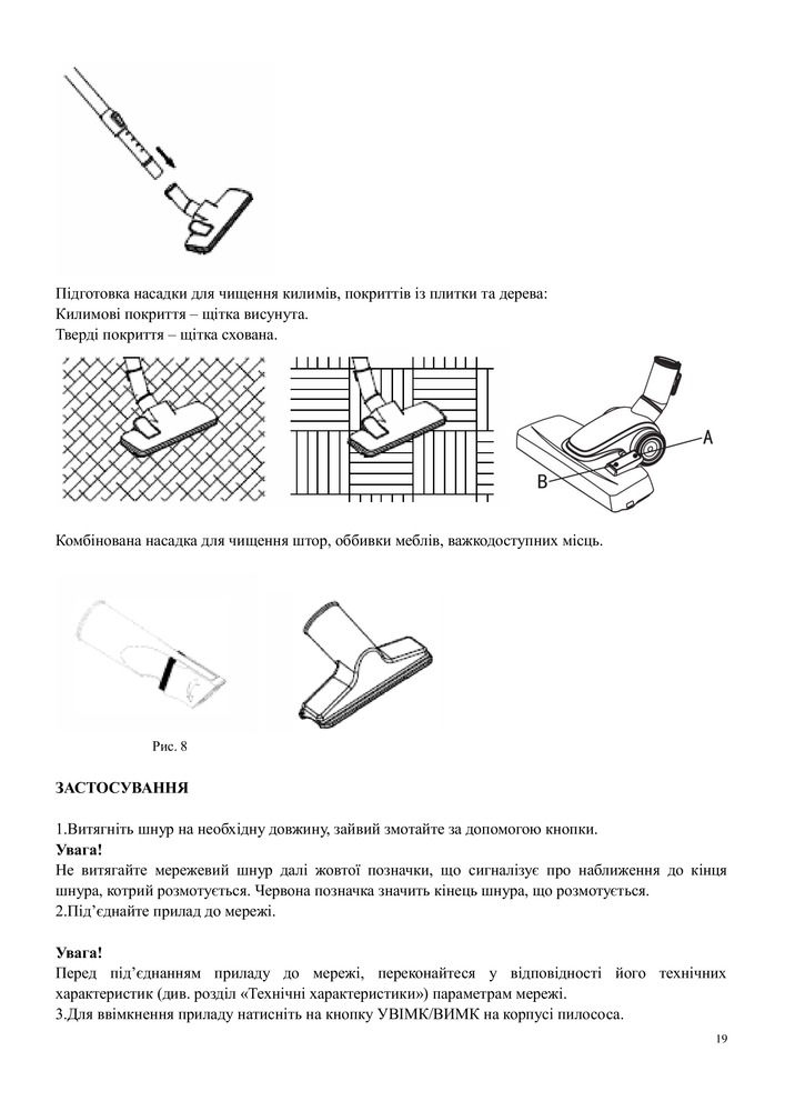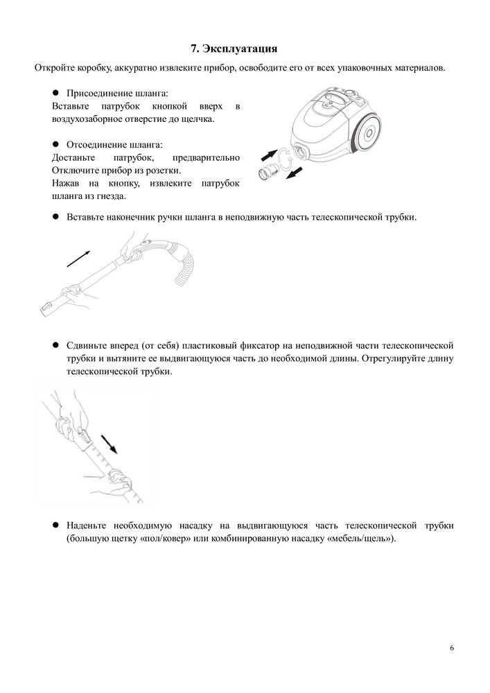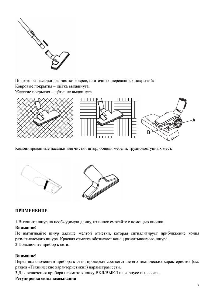 Набор насадок состоит из щетки для пола и ковров, оснащенной колесиками и клавишей переключения режимов (со щетиной и без нее), насадки, предназначенной для чистки обивки мягкой мебели, а также щелевой насадки, позволяющей убираться даже в тех местах, до которых сложно добраться при помощи универсальных щеток. В процессе уборки пользователь всегда может держать любую из вышеназванных насадок под рукой благодаря съемному держателю, который при необходимости можно закрепить на трубе. |