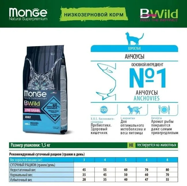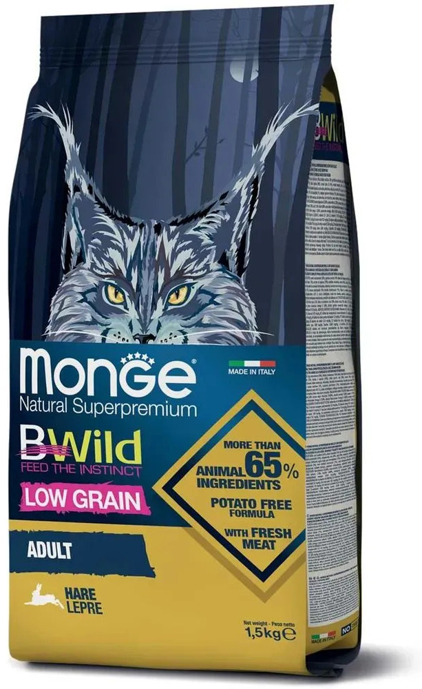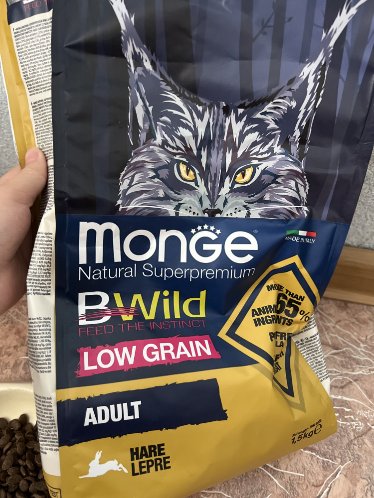 Monge Корм для взрослых кошек с диким зайцем «Bwild»+337 вкусный хороший состав блестящая шерсть мелкие гранулы хорошее усвоение