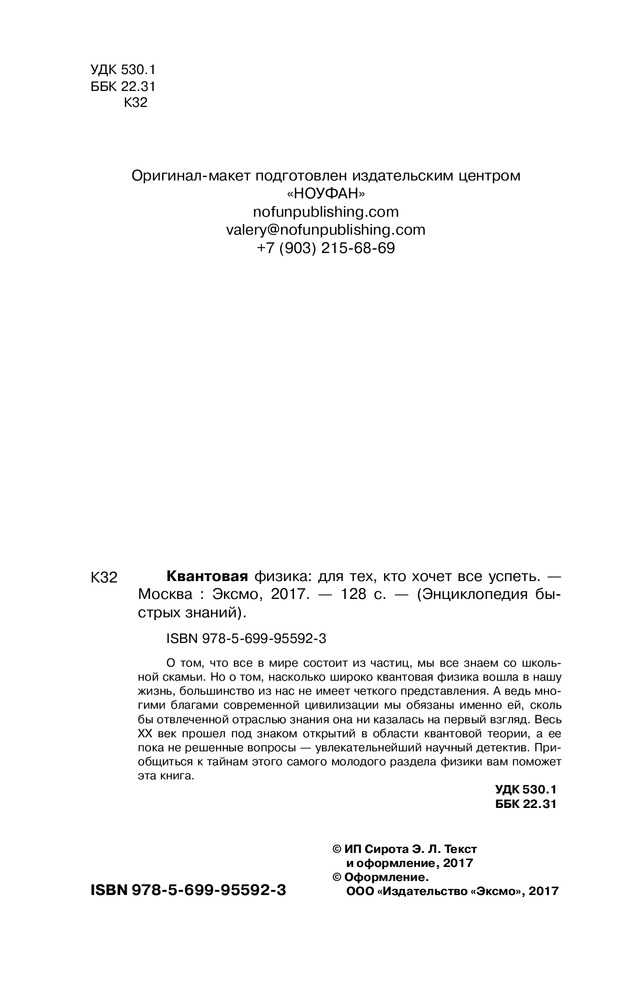 Книга интересна тем, кто хочет быстро получить базовые знания о квантовой физике и не только. Так как в книге приводится также информация об элементарном строении атома, чуток об ядерной физике и немного базовых понятий. Читается быстро и легко. PS О теории струн приведено лишь 3 страницы, имейте в виду)