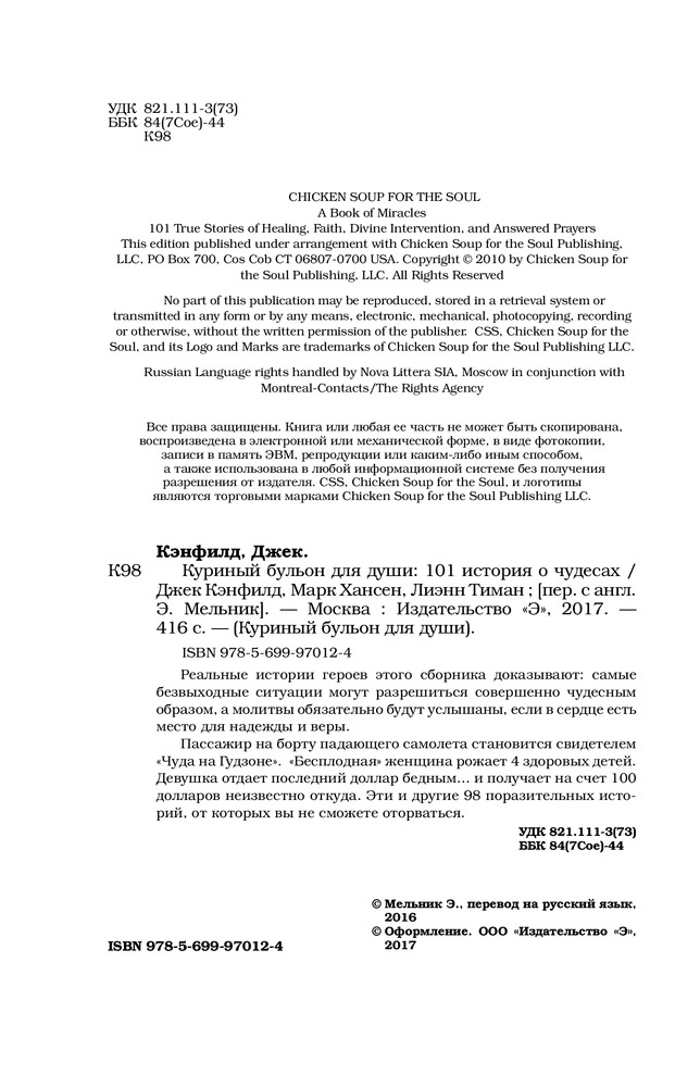 Куриный бульон для души: 101 история о чудесахВ данный момент этот товар отсутствует в продаже. Возможно, у нас найдется аналогичный или похожий товар здесь. Серия: Куриный бульон для души Реальные истории героев этого сборника доказывают: самые безвыходные ситуации могут разрешится совершенно чудесным образом, а молитвы обязательно будут услышаны, если в сердце есть место для надежды и веры. |