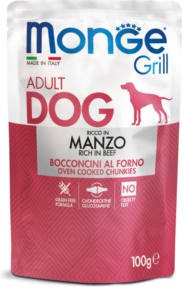 Monge Корм для собак Grill «Кусочки c говядиной» (100 г)+9 высокое качество вкусный кусочки мяса щадящий желудок
